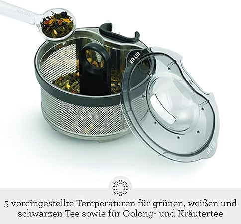 ( The fully automated tea filter descends and rises to perfect water temperatures, gently shaking the leaves and accurately infusing your tea to enjoy